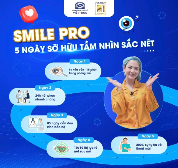 Smile Pro là công nghệ xóa cận hiện đại nhất hiện nay. Không chỉ sở hữu ưu điểm về thời gian chiếu laser 8 giây “nhanh như chớp”, Smile Pro còn giúp mọi khách hàng hồi phục thị lực nhanh chóng chỉ sau 5 ngày.