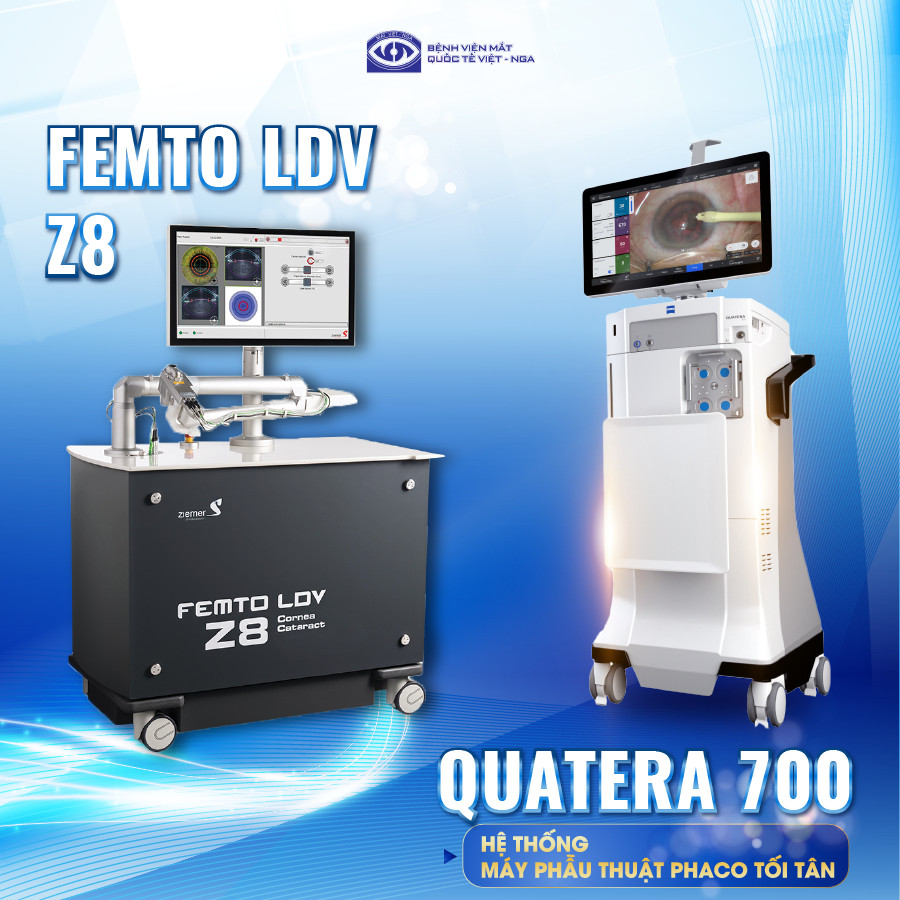 Mắt Việt - Nga cũng là bệnh viện sở hữu hệ thống máy phẫu thuật Phaco tối tân QUATERA 700 và đặc biệt là máy FEMTO LDV Z8 trong phẫu thuật Femto Cataract, giúp quá trình phẫu thuật diễn ra nhanh chóng, hiệu quả cao, chỉ diễn ra trong khoảng 5-10 phút.