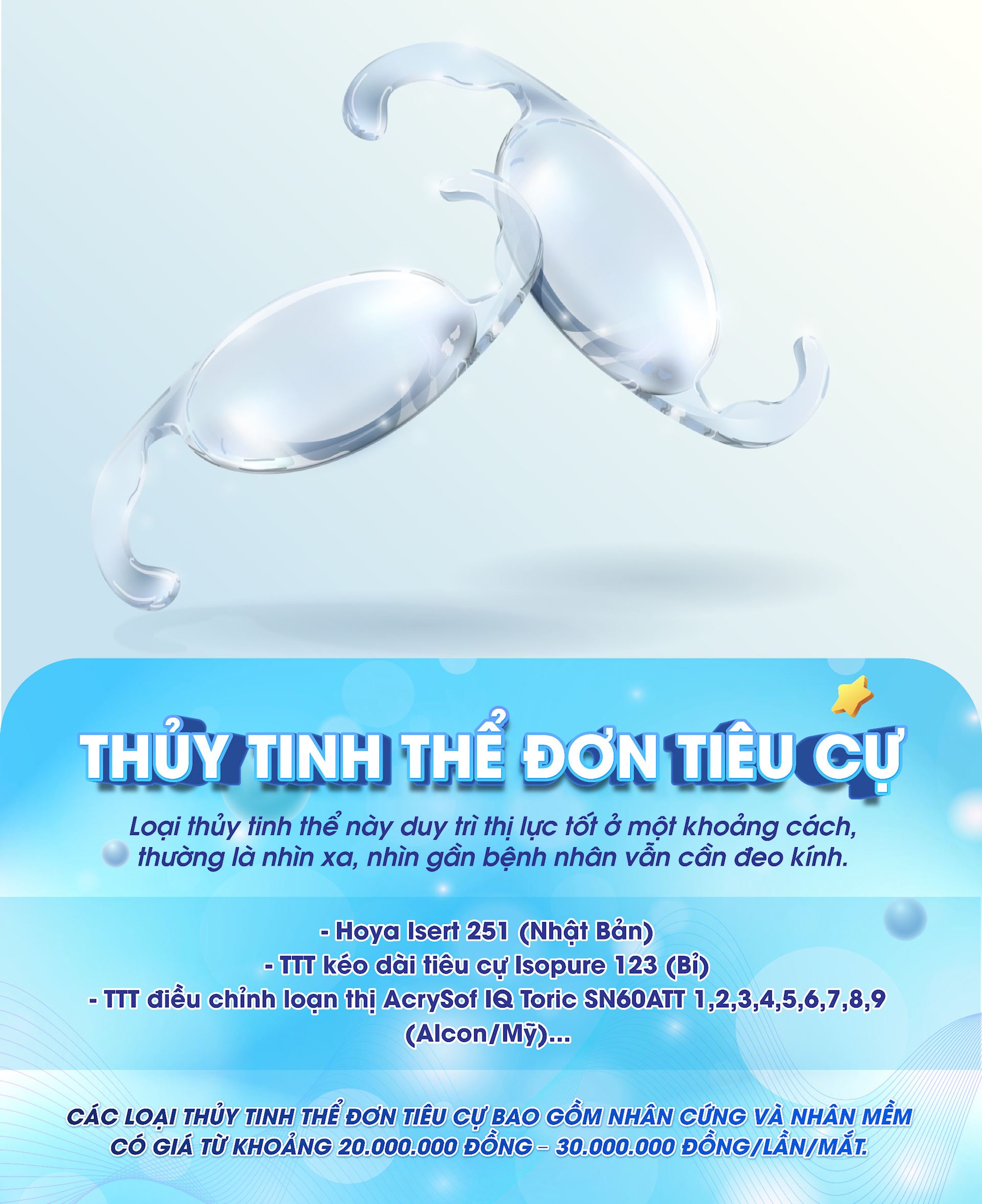 Cùng với đó, bệnh viện cung cấp các loại thủy tinh thể nhân tạo chính hãng đã được FDA công nhận như: các loại thủy tinh thể đơn tiêu, đa tiêu, thủy tinh thể mở rộng dải thị lực hàng đầu thế giới.