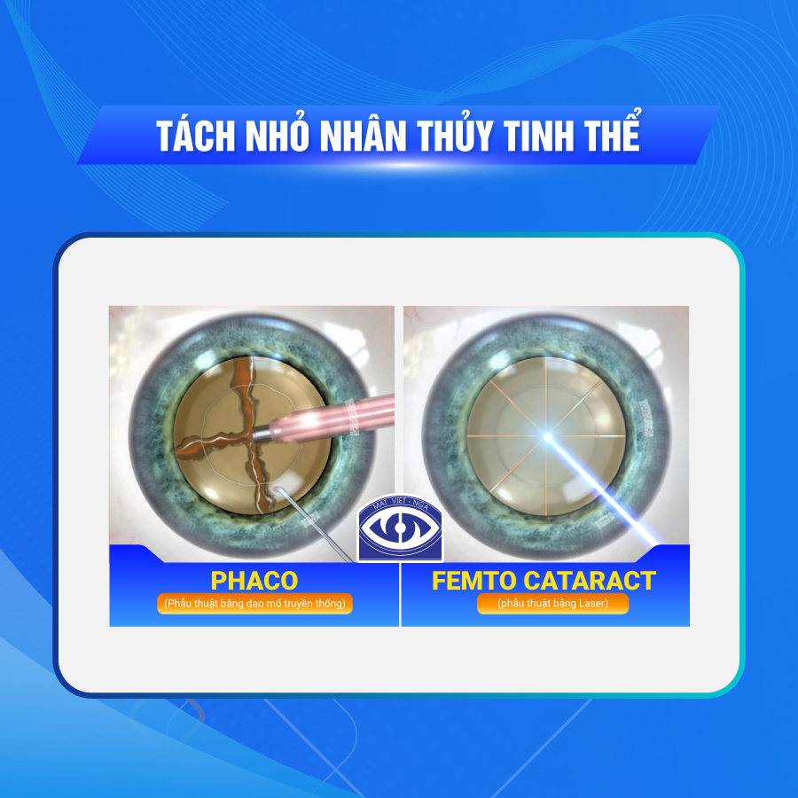 Hiện nay, phẫu thuật điều trị đục thủy tinh thể là phương pháp tiên tiến nhất nhằm mang đến đôi mắt sáng khỏe cho người bệnh. Mắt Việt - Nga áp dụng phương pháp phẫu thuật 𝐏𝐡𝐚𝐜𝐨 và 𝐅𝐞𝐦𝐭𝐨 𝐂𝐚𝐭𝐚𝐫𝐚𝐜𝐭. Đây là 2 phương pháp điều trị dứt điểm đục thủy tinh thể, hoàn toàn không đau, không chảy máu, an toàn và hiệu quả cao.