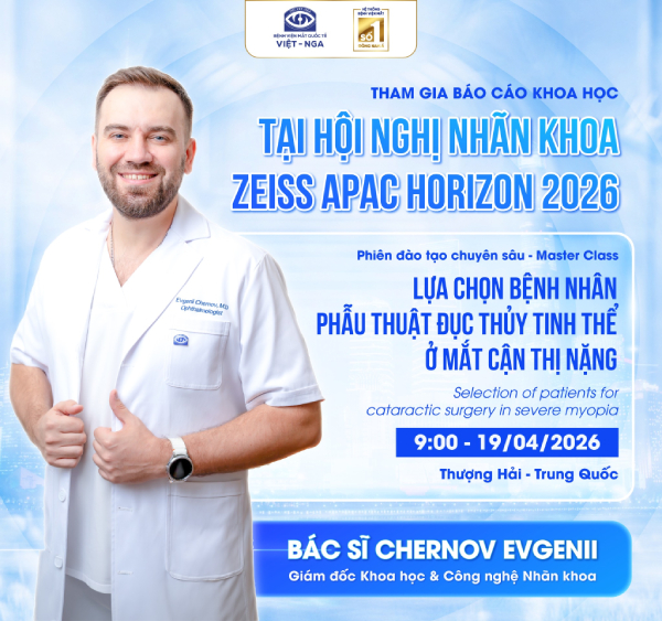 HORIZON 2026 ZEISS APAC Ophthalmology Symposium là hội nghị Nhãn khoa quốc tế lớn nhất khu vực Châu Á - Thái Bình Dương. Năm nay, BS Chernov Evgenii (Giám đốc Khoa học & Công nghệ Nhãn khoa) sẽ tham gia báo cáo với chuyên đề mang tính đột phá về phẫu thuật đục thủy tinh thể trên mắt cận thị nặng.